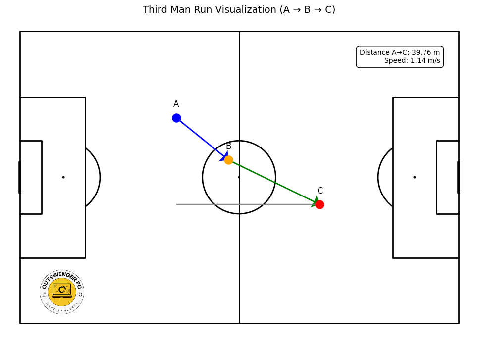 Let’s walk through how we identify and evaluate a third-man run using real match data. Imagine Player A, a midfielder, passes the ball from position (37.5, 20.2) on the pitch. Player B receives it and quickly lays it off to Player C, who arrives in space and receives the ball at (71.8, 40.3). By checking the event timestamps, we know this sequence happened over 35 seconds — enough time for Player C to make a significant off-ball movement. The key here is that Player A never passed directly to Player C; the move relies on coordination and timing, a perfect example of a third man run.