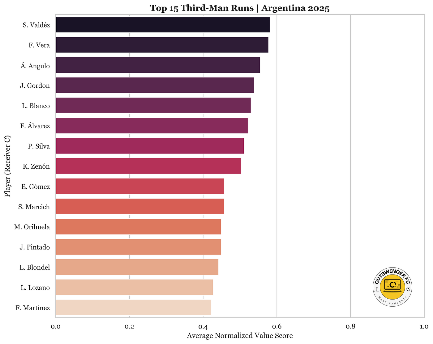 The distribution of normalized value scores for third-man runs appears healthy overall, showing a positive skew with most scores clustered between 0.2 and 0.5. This shape aligns with expectations in football, where high-value tactical patterns — like truly effective third-man runs — should be relatively rare. The presence of a single peak at 1.0 suggests a standout moment, potentially representing a high-speed, long-distance run that created significant forward momentum. Importantly, the model avoids overinflating value, as there’s no unnatural cluster near the top end of the scale, which supports its reliability in distinguishing impactful actions from routine ones.