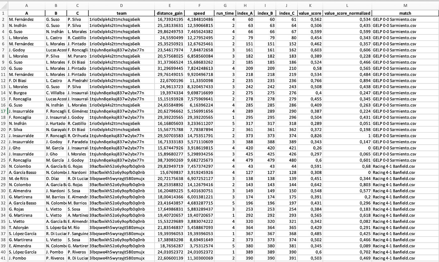 By running the Python code, I get the results of the third-man runs and every player involved. I also calculated a score that gives value to the third man run as to how useful it is. The Excel file that came out of it looks like this: