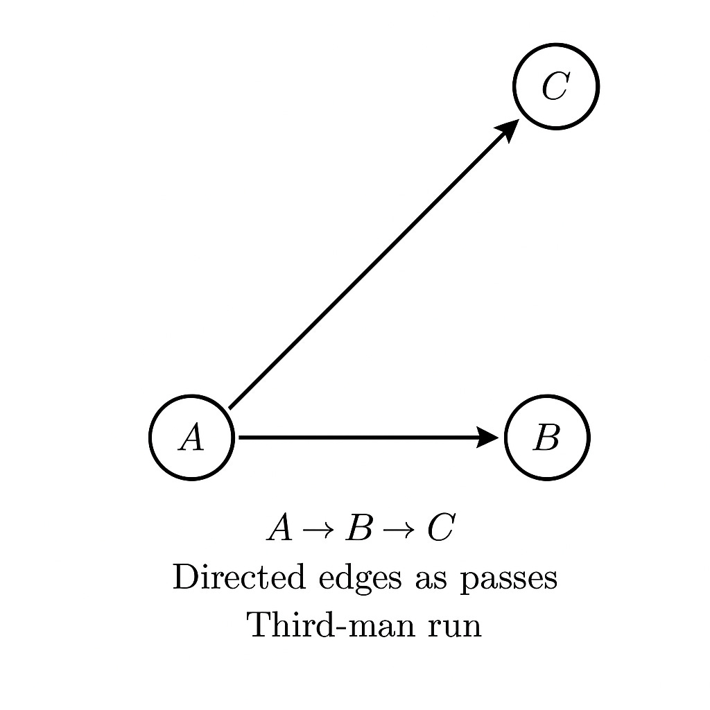 Over time, these passing sequences can be modeled as a Markov chain, where each player’s action (state) depends only on the previous action in the chain. While simple possession patterns often result in high state recurrence (e.g., passing back and forth), third man runs introduce state transitions that break the chain’s memoryless monotony. This injects volatility and forward momentum into the system — qualities typically associated with higher goal probability. By combining network topology, geometric analysis, and probabilistic modeling, we build not just a detector but a lens into one of football’s most intelligent tactical tools. And with a value-scoring mechanism grounded in normalization and vector calculus, we begin to quantify what coaches have always known: the most dangerous player is often the one who never touched the ball until the moment it mattered.