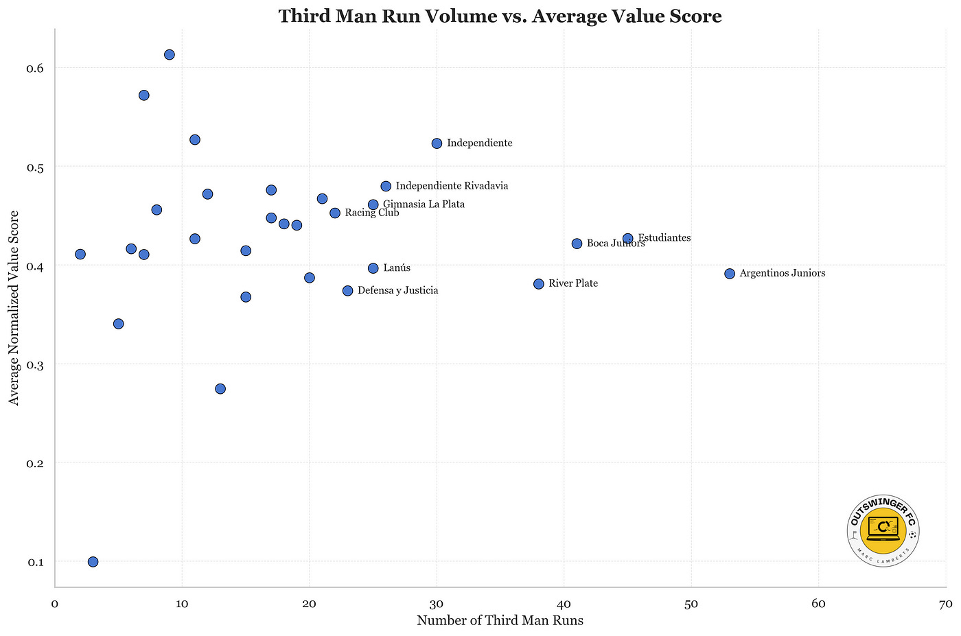 What we see is quite interesting. The majority of the teams have an average value between 0,3 and 0,5 per third-man runs. The more they participate in third man runs, the more the value is even. As you can see, the teams with the fewest have more positive and negative anomalies.