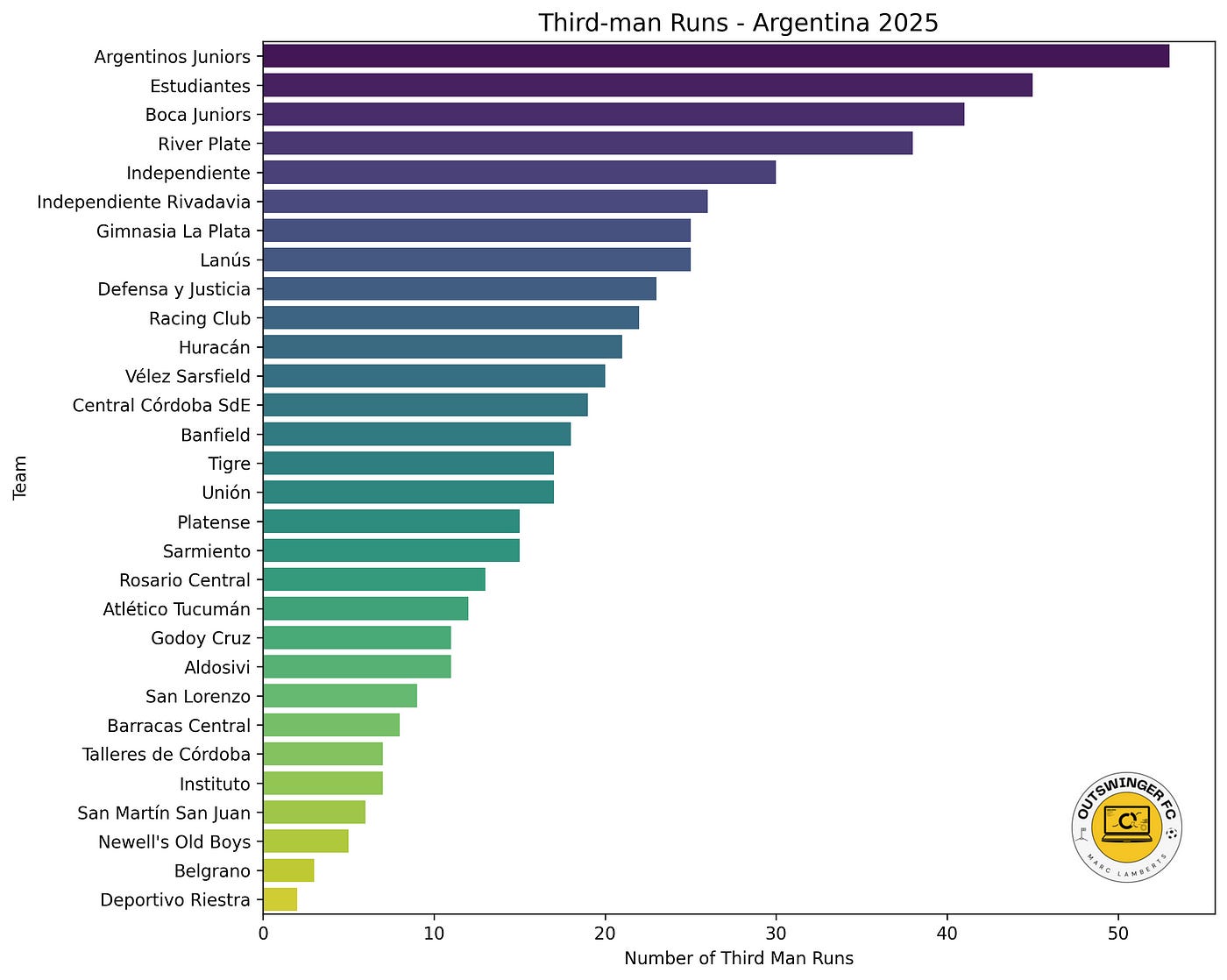 As we can conclude from the bar graph above, Argentinos Juniors, Estudiantes and Boca Juniors have the most third-man runs. Having said that, Newell’s Old Boys, Belgrano and Deportivo Riestra have the fewest third man runs.