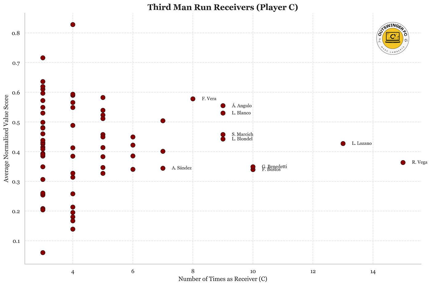 Finally, I want to find the players who are player C, as they are the ones doing the third-man run. I also want to see their value score on average, so we can see how dangerous their runs are.