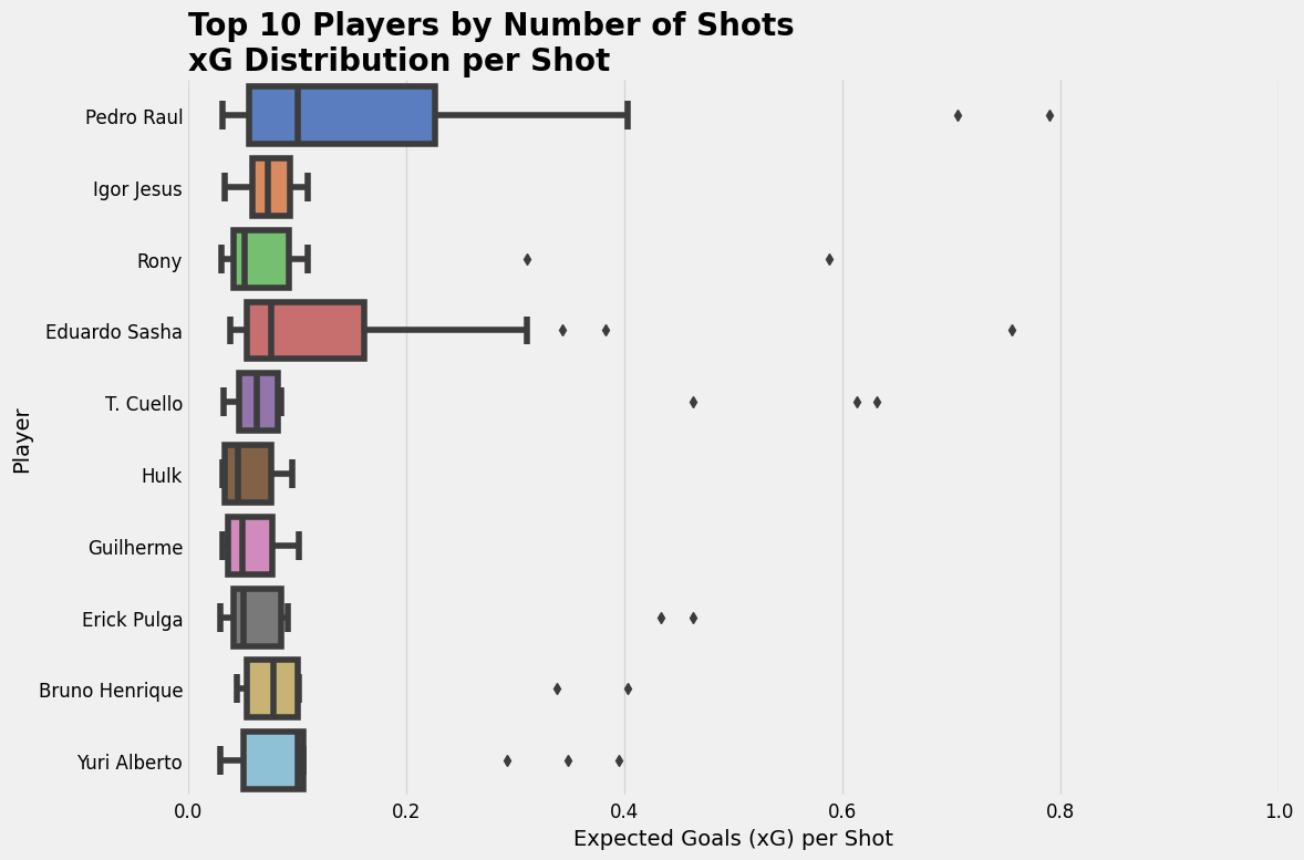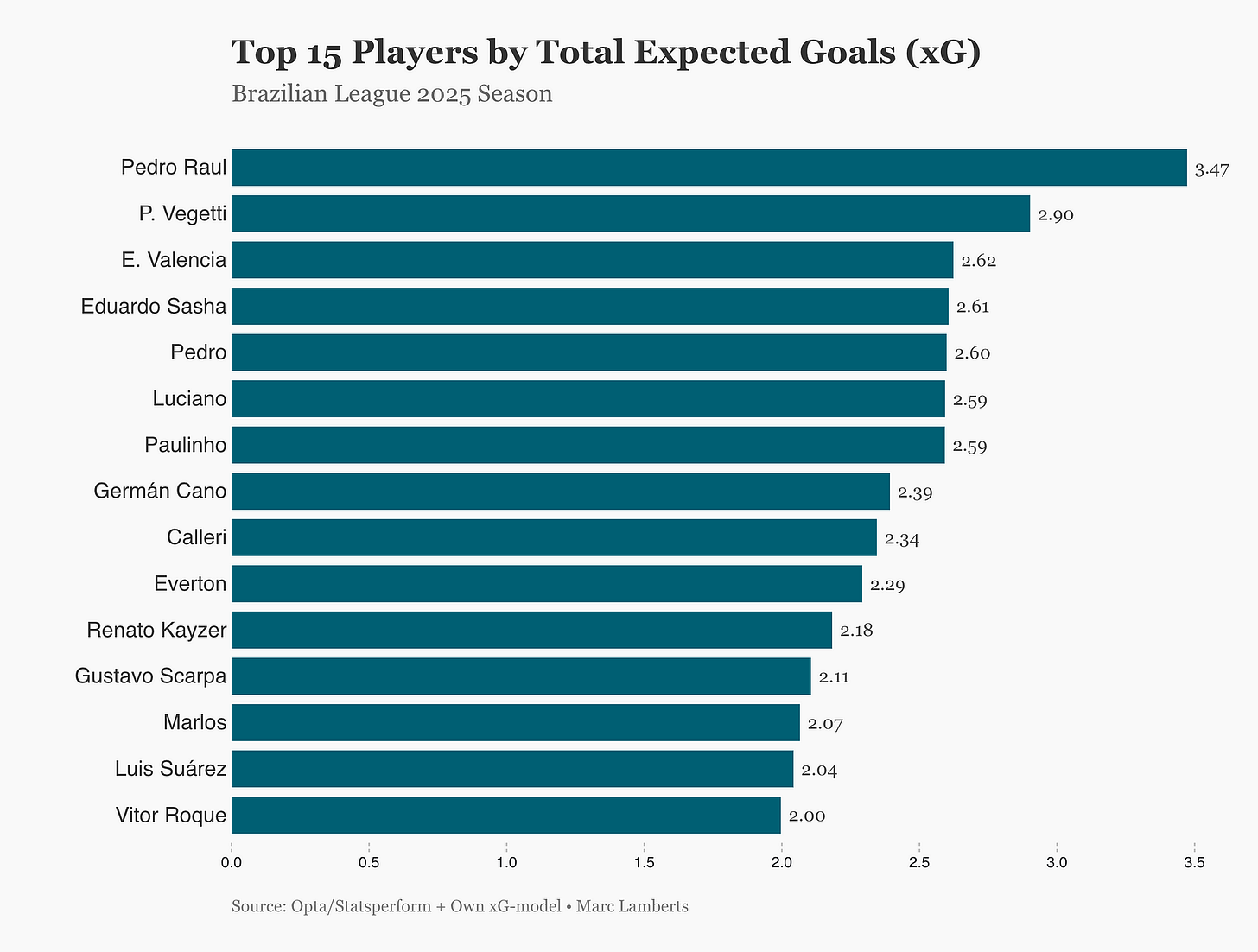 In short, this is what we can conclude: In the 2025 Brazilian league season, Pedro Raul stood out as the top player by expected goals (xG), showing his strong attacking threat. While there is a competitive cluster behind him, his advantage highlights his key role in creating high-quality scoring opportunities.