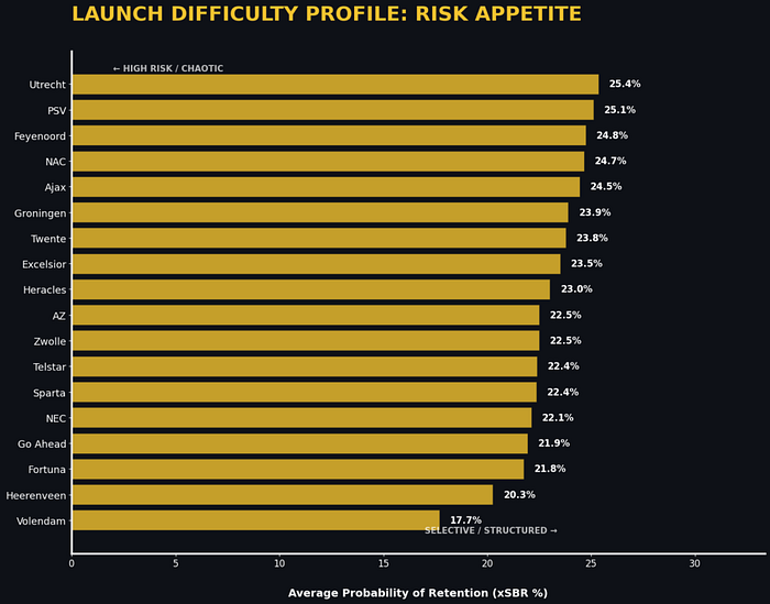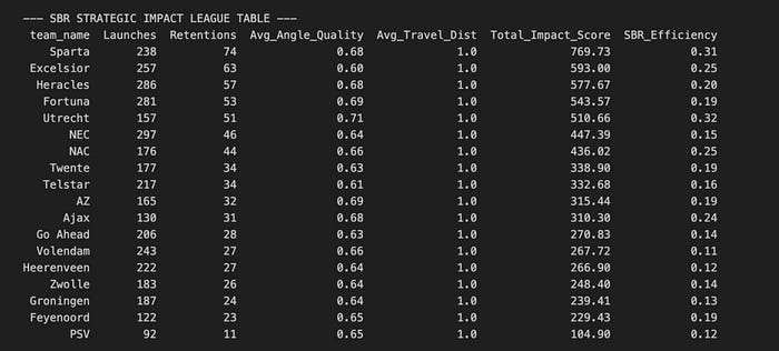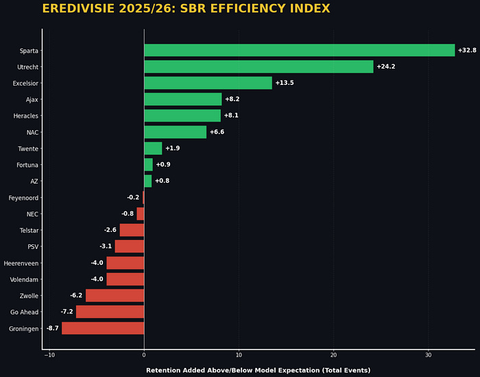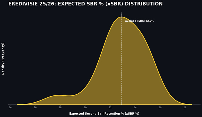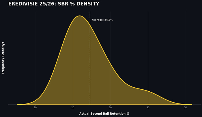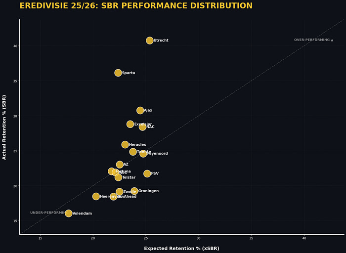 The significant delta between the maximum (50%) and Expected SBR (28%) indicates that Eredivisie teams in the 2025–2026 season are exhibiting high tactical efficiency and superior individual duel-winning capabilities. The model provides a physics baseline (28%), meaning that the remaining 22% of retentions are a direct result of coaching structure and player quality rather than the ease of the pass itself.