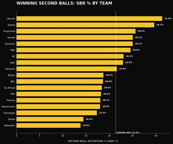 So, how can we now see what this looks like? In other words, for every team in the Eredivisie, how often do they win the second ball and therefore keep possession via the second ball?