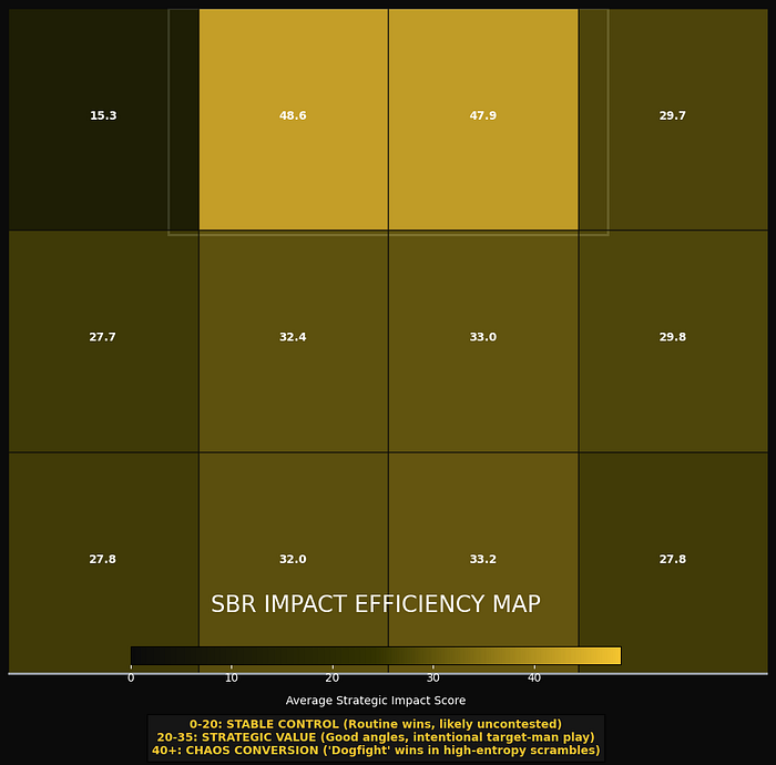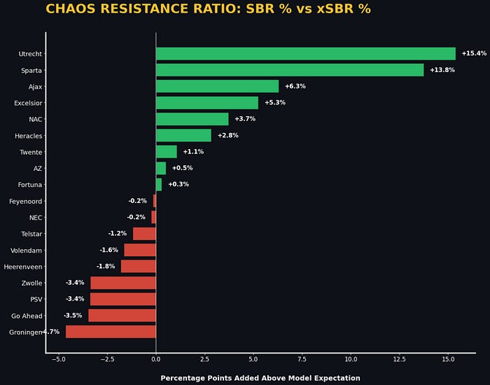 The Chaos Resistance Ratio in isolation performance in “Broken Play” scenarios specifically filters for events with an xSBR of less than 20%. In these high-entropy instances, the ball is objectively “50/50” or worse. Teams with a high Ratio in this category demonstrate systemic resilience to randomness, evidencing a team that thrives in the “scramble” phase of the game. This would be an essential metric for recruitment and scouting as it would identify squads that can maintain possession and territory in high-pressure match scripts where clean tactical structures have broken a vital trait for success in knockout competitions and high-intensity derbies.