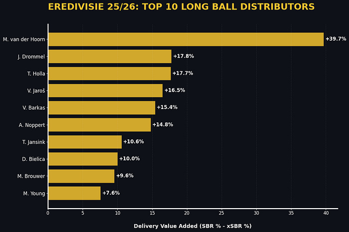 In the bargraph above, you can see the players whose long ball lead to the highest value added in terms of second ball retention. What’s interesting is that most of these players who rank high are also from the goalkeepers’ rank, but M. van der Hoorn just stands out from the crowd.