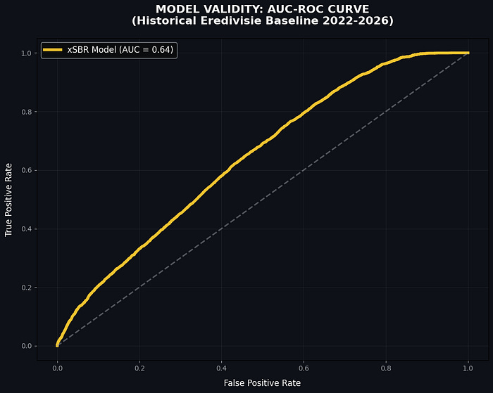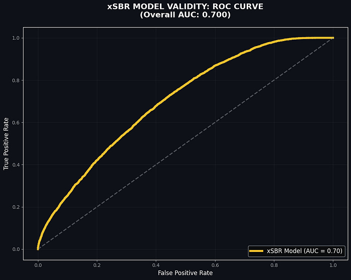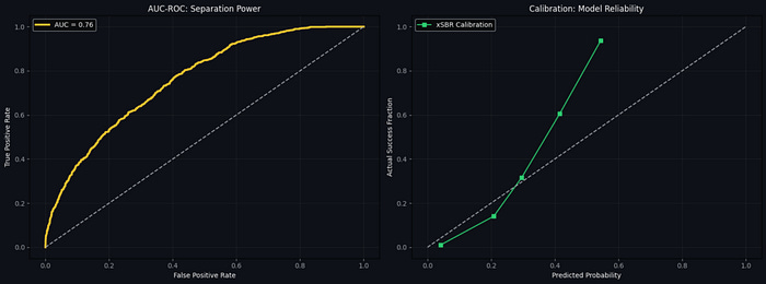 The xSBR model achieved an AUC-ROC of 0.76, indicating a high degree of predictive reliability. The model successfully filters out ‘statistical noise,’ allowing us to isolate genuine tactical over-performance from random chance. 0.76 means that if we randomly picked one successful retention and one failed retention from our 100+ files, there is a 76% chance the model would correctly identify which one was which.