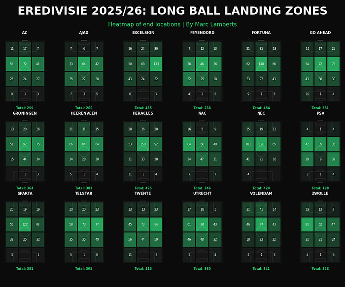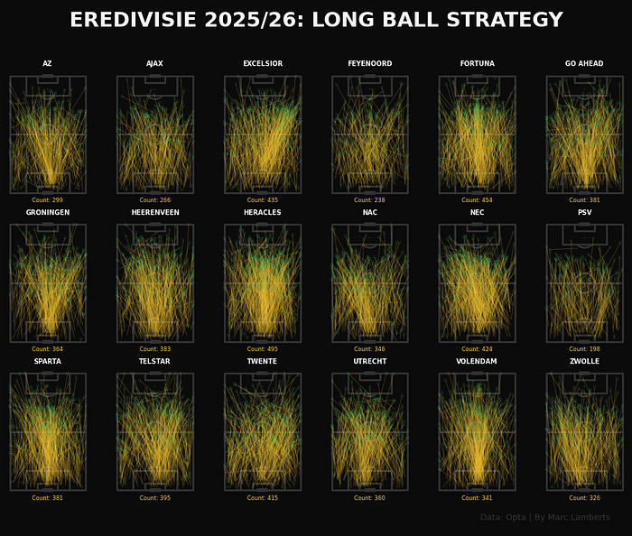 In the image above, you can see the long balls by each team in Eredivisie 2025–2026. It features the counts of these passes as well as the locations where they are. At first glance, we can see that many of these particular passes have come from the middle and from the goalkeeper areas.