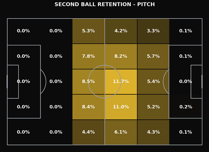 In the pitch map above, we can see the locations of where the second balls by the teams in the Eredivisie. This gives us a more clear idea of where they mostly happen and where. We have to concentrate in terms of long balls. What’s evident is that most the second balls happen in the attacking half, but more in the middle third than in the attacking third.