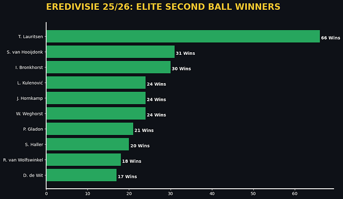 Here we see the players who win the most second balls. Lauritsen is an exceptionally good second ball winner, followed by Van Hooijdonk and Brinkhorst.