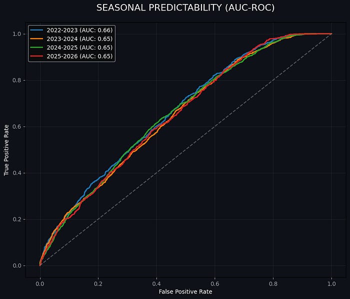 When we load the multiple seasons we can see that the AUC value has dropped to 0,64. The model has dropped from a good predictive model to a standard or even weaker model. How is this possible? This can be because of the calculations, but it can also happen because of factors within the league.