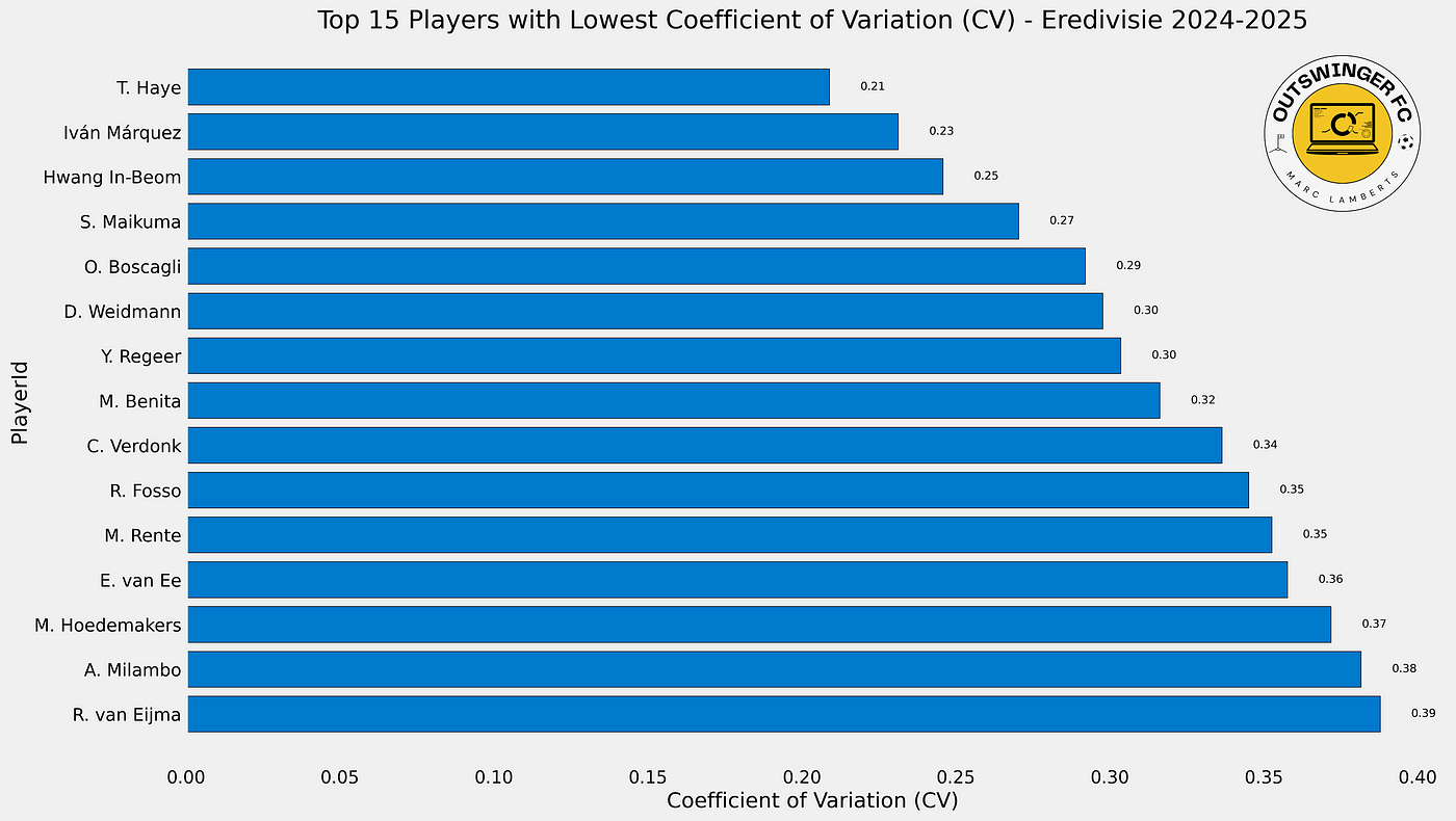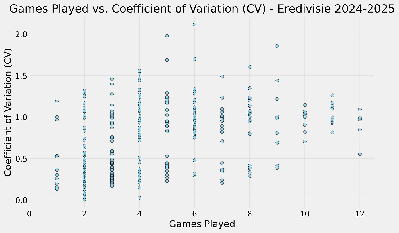 print(f"\nResults saved to {output_file}")As a result, I get an Excel file that shows me the PlayerId, the mean, the standard deviation and the CV. The matches played are also included. Now we have the framework on which we can start analysing.