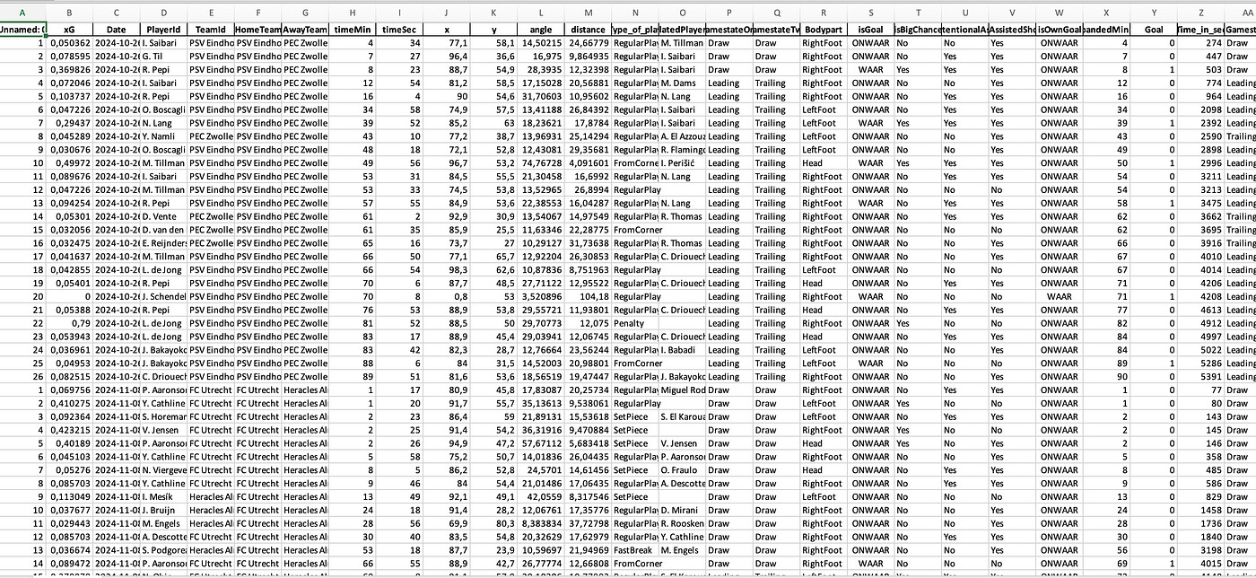 The data used comes from Opta and was collected on November, 22nd 2024. It has event data from the 2024–2025 Eredivisie season up to matchday 12 and is still all raw data. The data that is collected is individual data for each match and not totals, because we need match-level data to measure consistency.