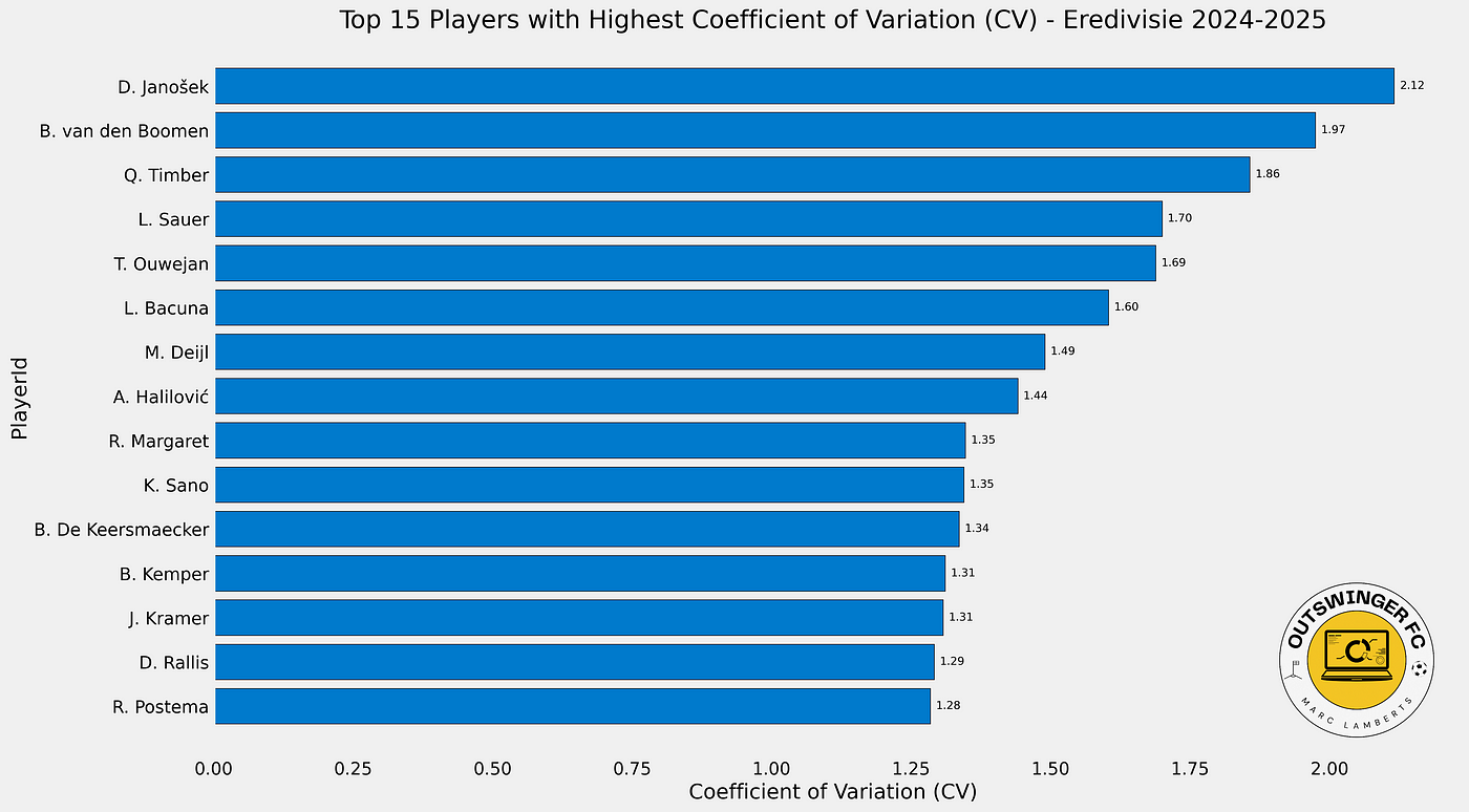 This can have several reasons why these players are featured in the low CV or in the high CV. The most common are position, how the team performs, how strong the opposition is. However it shows consistency or inconsistency, which is the aim of this metric.