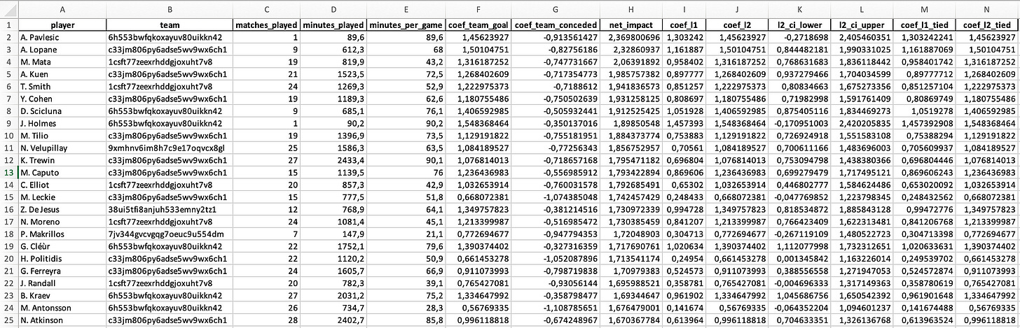 Just as I mentioned above, I wanted to examine the impact of players on team performances beyond the pure goal contribution metrics. My aim is to measure what players have impact — both positively and negatively — and to see which players are best to bring on in the game.