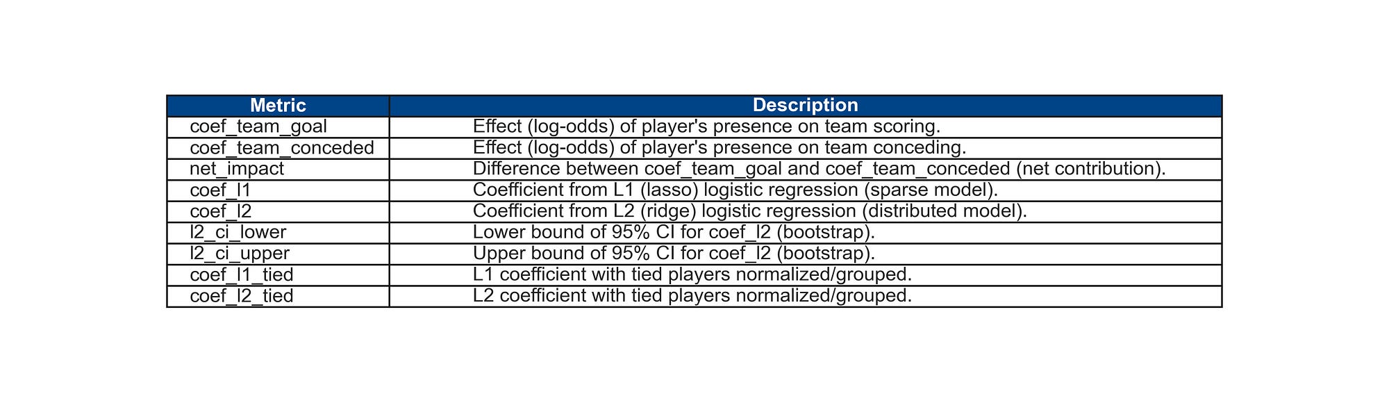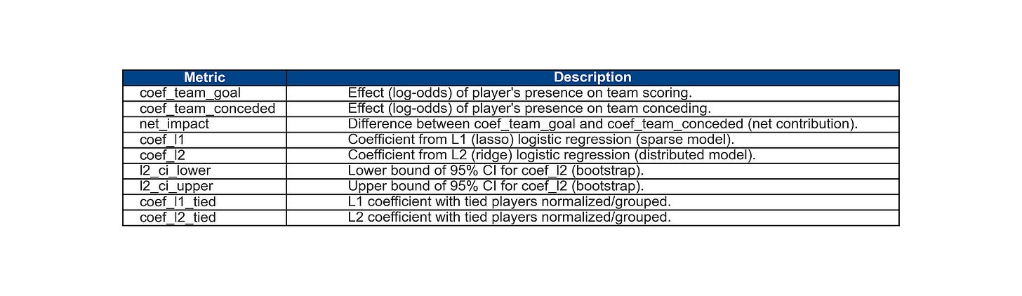 Trained separate logistic regression models for: Player contribution to scoring goals. Player contribution to conceding goals.