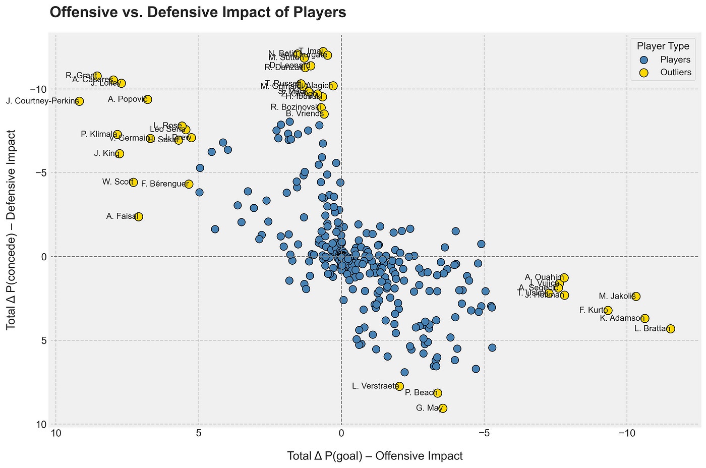 In this scatterplot, we see outliers for their offensive impact and defensive impact. Which means that these players have a positive impact: it’s negative for the team when they aren’t on the pitch and positive when they are on the pitch. This can help make an informed decision on whether players should be on the pitch at the start and which players are the best to bring in from the bench.