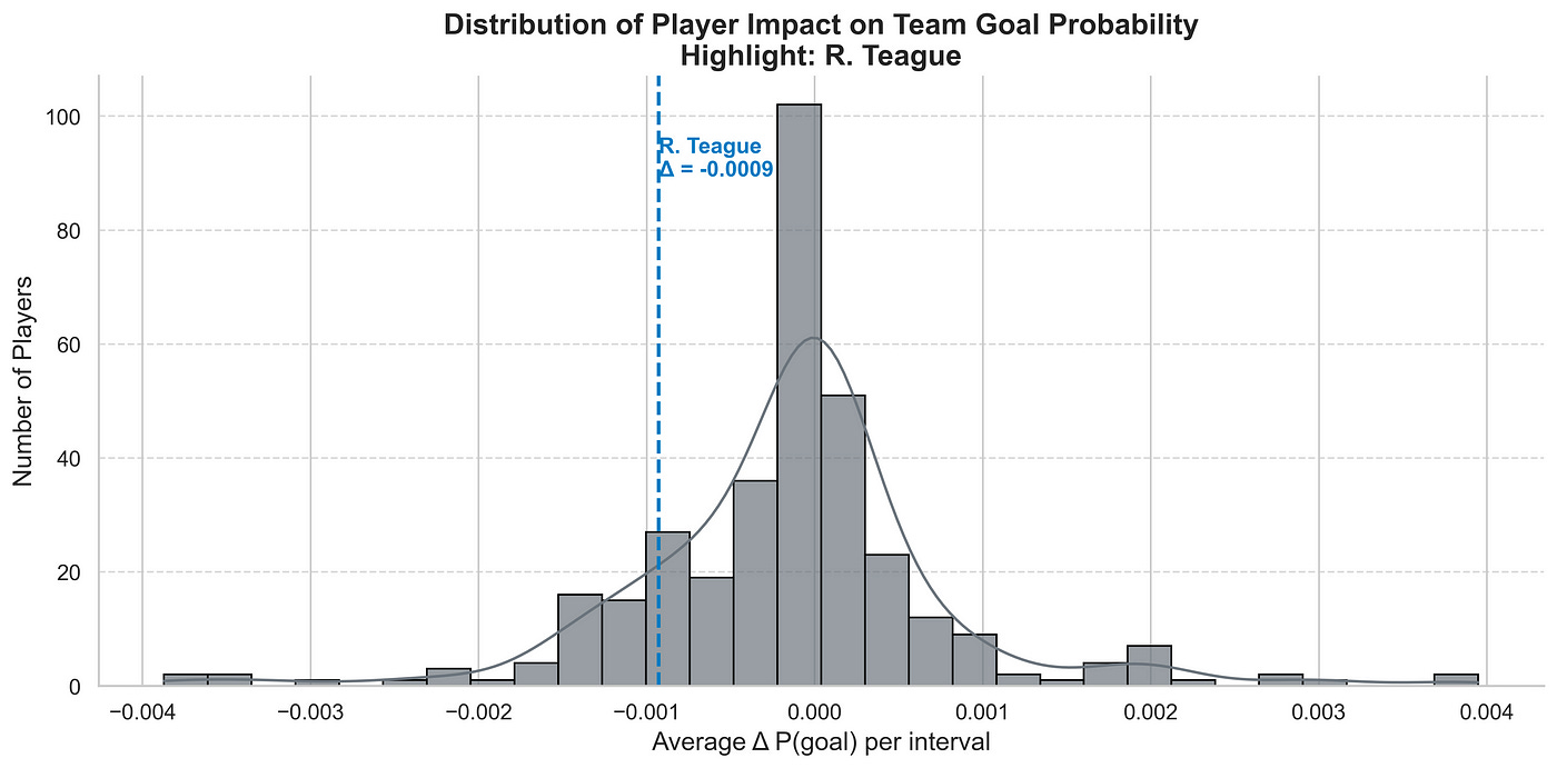 It shows R. Teague playing for Melbourne Victory. It shows the distribution of average change per interval, whether a player is on the pitch or not. The most players have a delta of 0,,0 which means there is no difference if they are on or off the pitch. Teague, however, has a delta of -0,0009 — which roughly means that removing R. Teague from the pitch will lead to 0,9% fewer goals throughout the season.