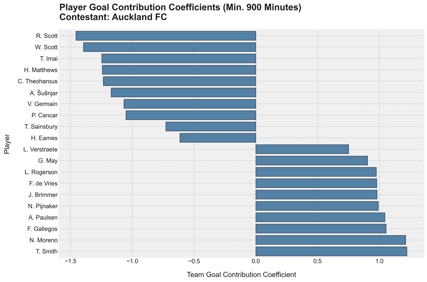 For example, here we have a look at Auckland FC and our model has calculated which players have the most impact/effect on the goal contribution probability. It’s very important to play R. Scott, W. Scott and T. Imai, while it’s a good idea not to bring F. Gallegos, N. Moreno and T. Smith to the pitch.